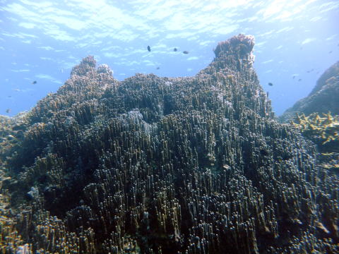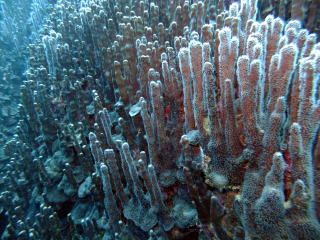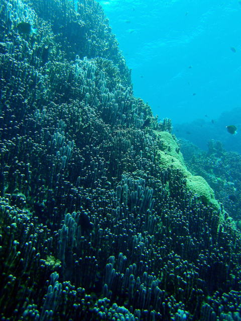 ここ大浦湾のアオサンゴは 1本1本が棍棒状なのが特徴。 (ことば) 棍棒・・・相当な長さのある木の 棒切れのこと。 |