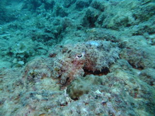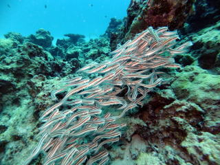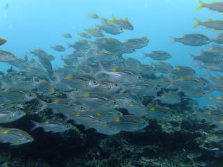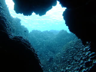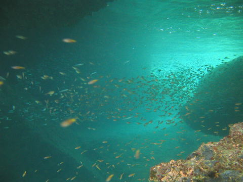 | (右)水深はすごく浅いのですが、生き物観察好きの ダイバーにはこの浅さでも十分。 通り抜けできるトンネルがあり、ハタンポや キビナゴがどっさり群れてます! 夏はサカナたちの繁殖期なのでとても活発です。 |