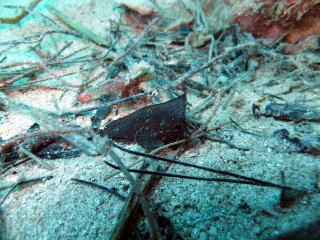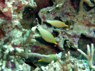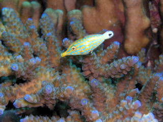 サンゴばかりに目がいきがちですが、 マクロ系生き物も潜む。 (左)カミソリウオ、(右)アカメハゼ (下)テングカワハギは私自身も 大好き★な生き物です! テングカワハギの様子を 『YouTube』でどうぞ。 |
