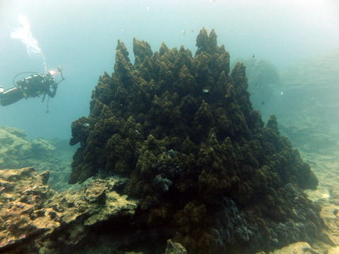 大浦湾のシンボル『アオサンゴ』と並んで 存在感のある長寿サンゴ2種。 (左)通称『宮殿サンゴ』 (右)『フカアナハマサンゴ』 |
