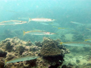 大浦湾にはいたる所に点在する 塊状ハマサンゴの群集ポイントがある。 そこにこのタイワンカマスの大群が いたりいなかったり・・・。 トウアカクマノミやトウカムリガイなどが棲息 塊状ハマサンゴの様子は こちら『YouTube』でどうぞ。 |