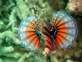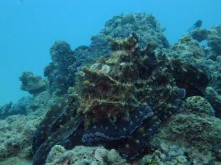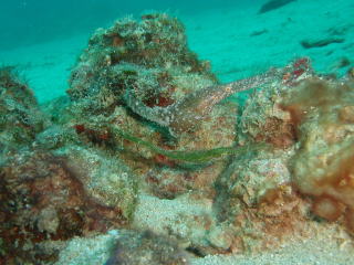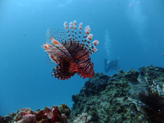 (左)沖の根に大きなハナミノカサゴが2匹。 この様子は『YouTube』でどうぞ。 ここではハダカハオコゼが見つかったり、 以前はカメもこの根で一休みしていた こともあるそう。 浅瀬ではノコギリダイやアカヒメジが群れ そしてサンゴ群も楽しめいいポイントです! |