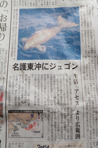’12.2/29、大浦湾に隣接する 天仁屋沖崎でジュゴン1頭が 確認されました。 ジュゴンの存在は 夢物語でも何でもありません。 この海域で普通にジュゴンは 棲息しています。 ジュゴンが安心して生活できる 場所にしたい。 みなさんの想いも一緒では ないでしょうか。 |