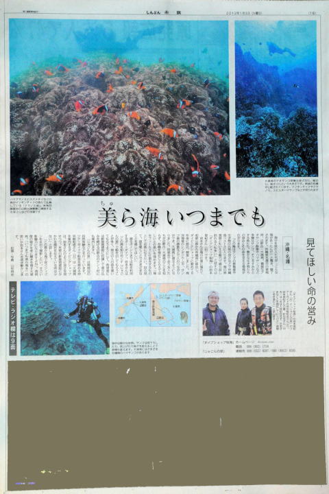 ’11.12月、赤旗新聞社のY記者から 取材を受け大浦湾をご案内しました。 そして、 ’12.1/3『赤旗新聞』に載りました。 この海は今、新基地建設の候補地に なっています。こんな素晴らしい海が 東京ドーム40個分以上もの土砂で 埋め立てられようとしています。 生き物を守りたい。 サンゴを守りたい。 そして何より この環境を守りたい。 今このページをご覧のあなたにも 大浦湾の素晴らしさを伝えたい。 。 |