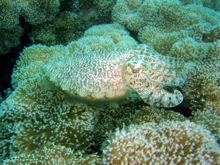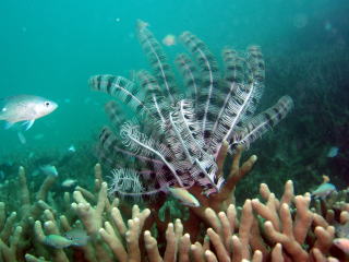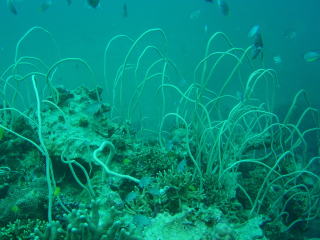 実は「ポリプ」なんです。 8本の“羽状触手”でプランクトンを捕まえます。 アオサンゴも造礁サンゴ同様に栄養分の多くを体内に共生している 褐虫藻からもらってます。 8本の触手を持っていることからどちらかというと ソフトコーラルに近い仲間になるという。 |