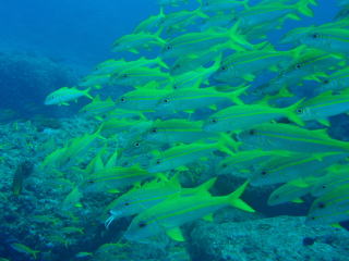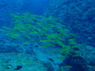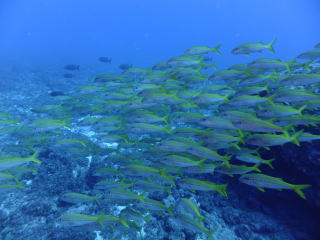 (左)水深20〜25mの所にこの『アカヒメジ』 の大群!まとまっていると圧巻だ。 この様子はこちら『YouTube』で。 (右)突然『カンパチ』も現れたり・・・ |
