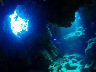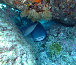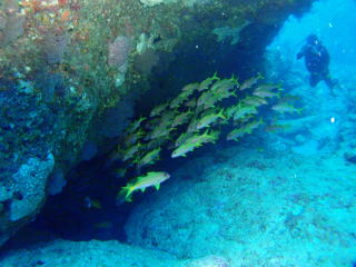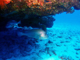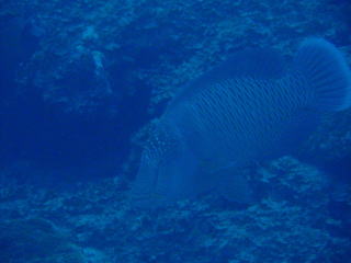 (左)このナポレオンは、ここを縄張りに してるようです。 ダイバーを見ると岩の隙間に身を隠す。 |