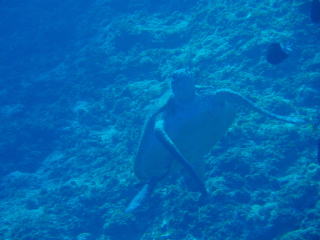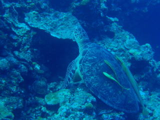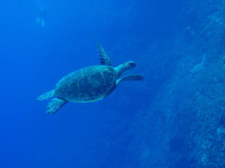 (左)ルカン礁の主『アカウミガメ』。 噂では超デカイのが居るとか!? どこからともなくやってくるので ワイドの目でキョロキョロしながら潜ってね。 『YouTube』でどうぞ。 |
