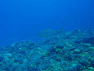 (左)通称『GTホール』。 当たればロウニンアジ、ホワイトチップ、 マダラエイなどの大物が潜む場所。 動画は『YouTube』でどうぞ。 ロウニンアジがやってきた! 動画は『YouTube』でどうぞ。 根の上のサンゴは見事! ノコギリダイやキンギョハナダイなどの 大群も見逃せない。 |