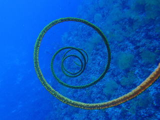 (右)美しいですね!『ハナゴンベ』。 ドロップ沿いにたくさん居ます。 (左)壁からはネジレカラマツや ムチカラマツがたくさん伸びている。 |