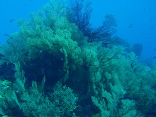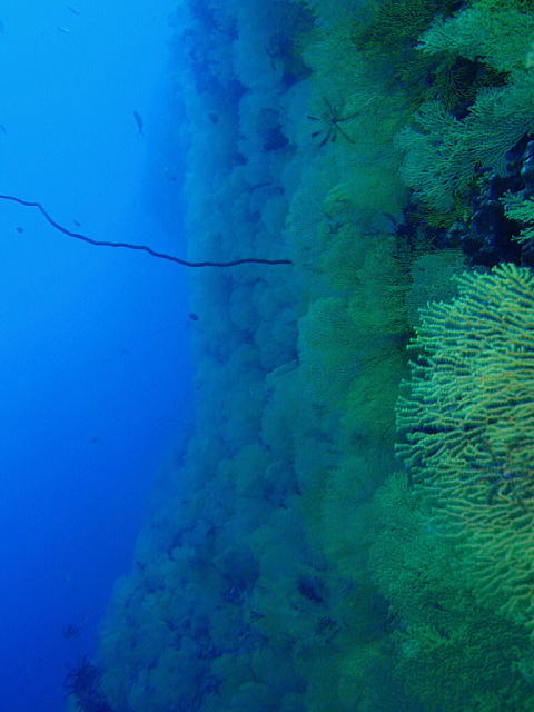 (右)基本的にドロップが続く地形ですが、 浅瀬に行くと色とりどりのサンゴも見られる。 ハナダイの仲間、スズメダイの仲間が たくさん群れておりとても美しい。 |