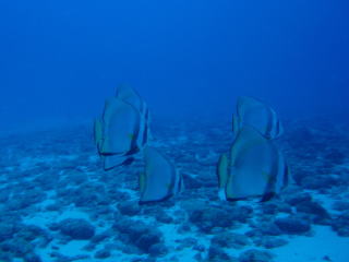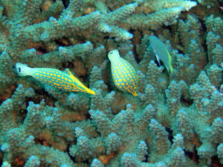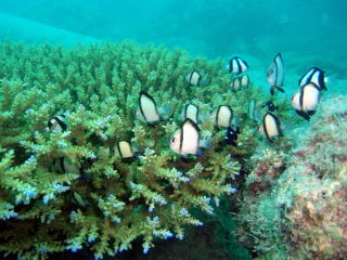 | (上)ナンヨウハギの子供を好きなダイバーは 多いはず。実は私もその一人です。 夏にはこのサンゴの上にこの子供たちが たくさん群れてる姿を見ることができる。 |